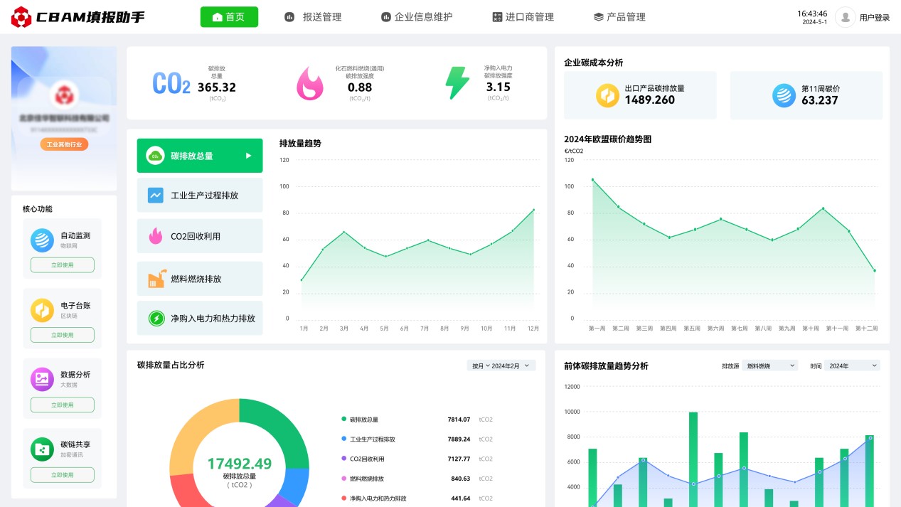 2023年10月1日起,歐盟碳邊境調(diào)整機(jī)制(CBAM)已進(jìn)入過渡期,CBAM涵蓋范圍的出口產(chǎn)品需按時(shí)提交產(chǎn)品碳排放報(bào)告,未提交報(bào)告的企業(yè)將面臨高額處罰。為解決企業(yè)由于官方政策文件理解難度大,專業(yè)門檻高,數(shù)據(jù)搜集難度大,部分?jǐn)?shù)據(jù)缺失無法填等困擾,推出碳關(guān)稅管理平臺(CBAM填報(bào)助手),通過數(shù)字化方式,為企業(yè)提供碳數(shù)據(jù)填報(bào)、碳數(shù)據(jù)核算、碳數(shù)據(jù)報(bào)送、碳數(shù)據(jù)認(rèn)證、咨詢培訓(xùn)等全流程服務(wù)。可極大減少企業(yè)碳排放報(bào)送門檻,助力企業(yè)低成本合規(guī)報(bào)送碳排放數(shù)據(jù)。